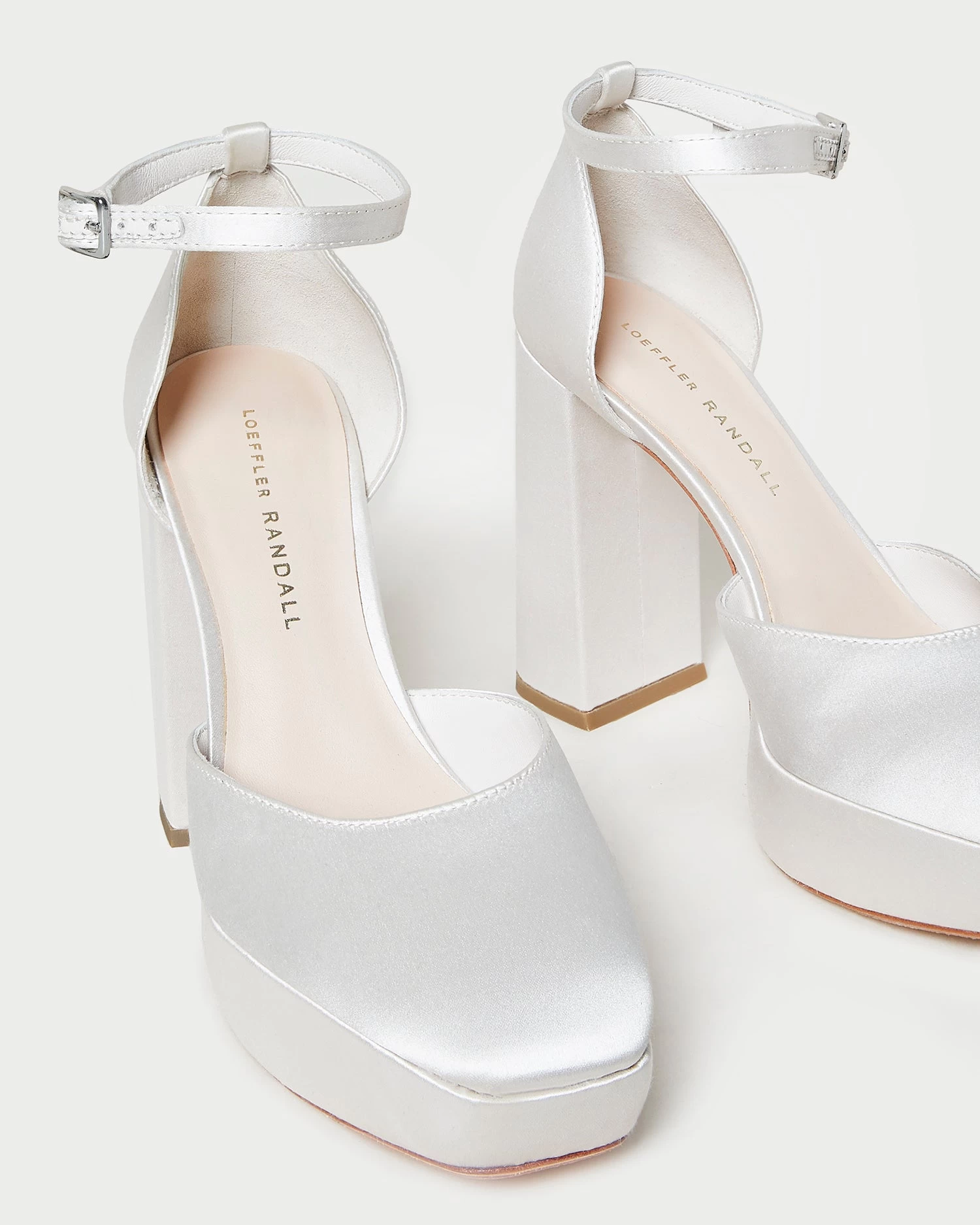 Closed-toe platform heel in cream satin. Features a padded footbed, round toe, and adjustable ankle strap closure. 4.5 inch heel, 1.5 inch platform.