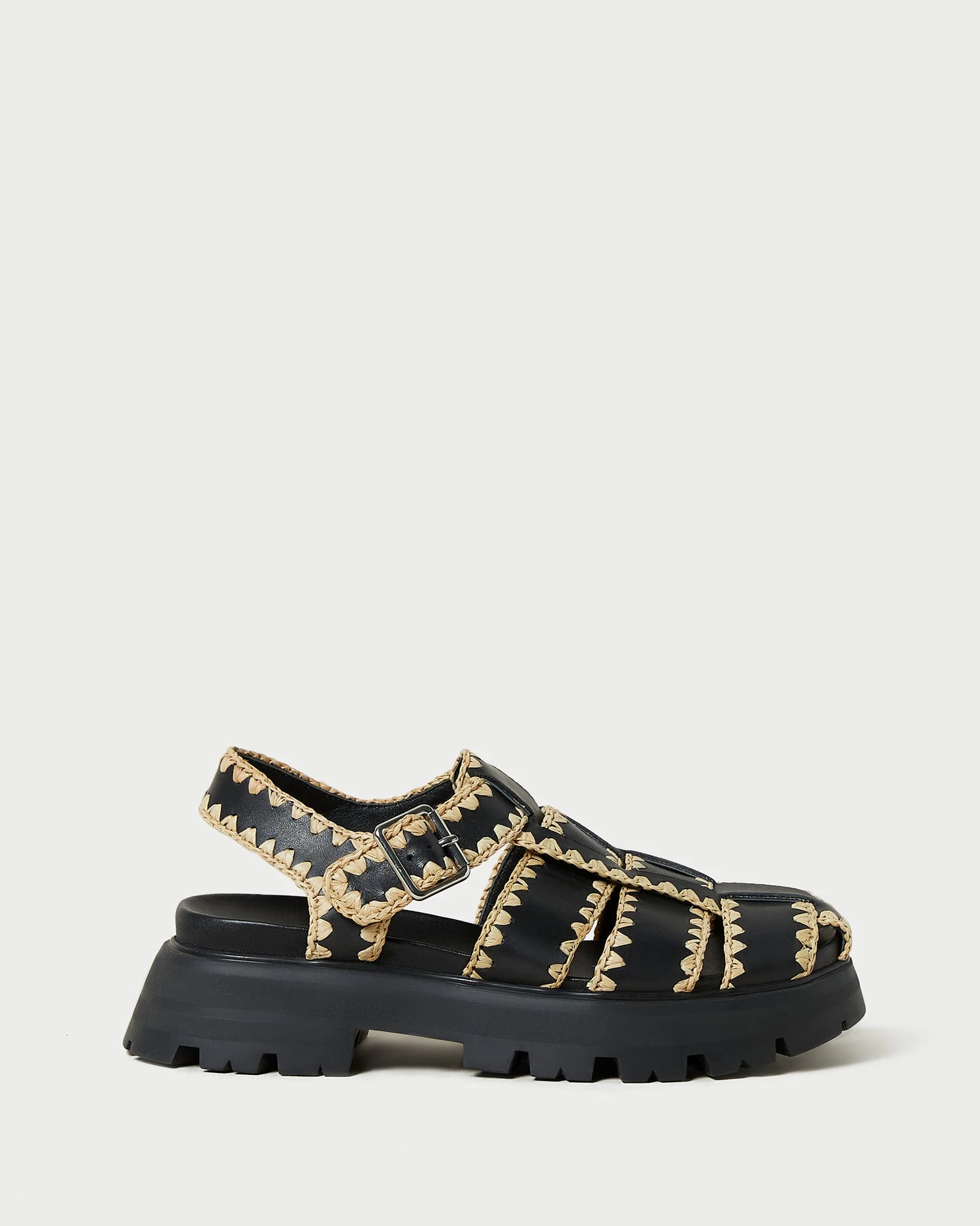 Fisherman-style caged platform sandal in black vachetta leather with natural raffia whipstitch detailing. Features a round toe and adjustable buckle closure. 1.5-inch platform.