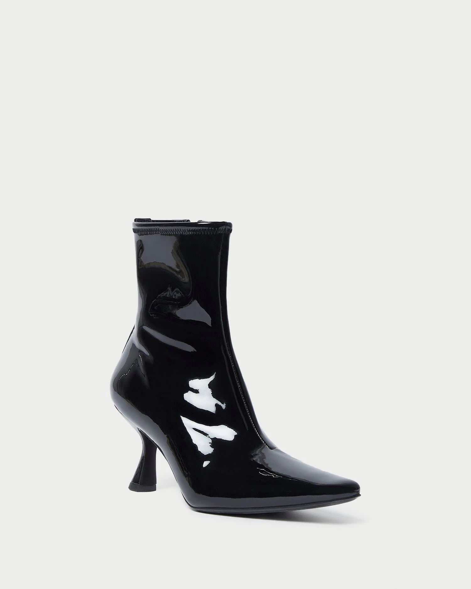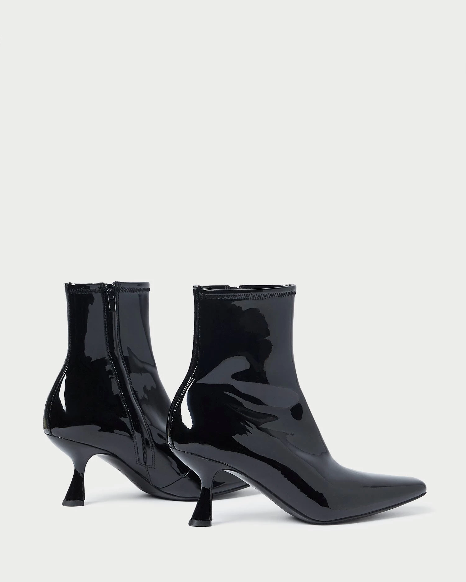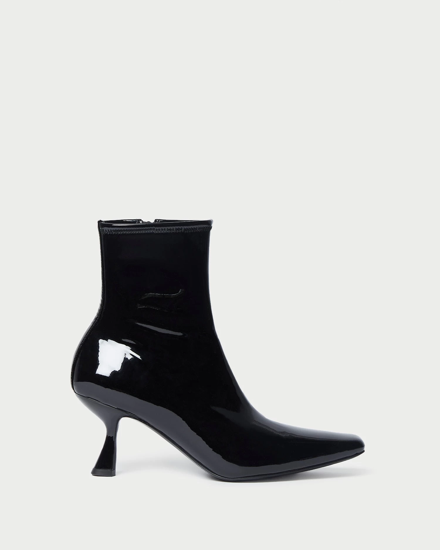 Heeled bootie in black stretch patent leather. Features a padded footbed with gold stamped logo, an elongated squared toe, and a side zipper closure. 2.75-inch heel.