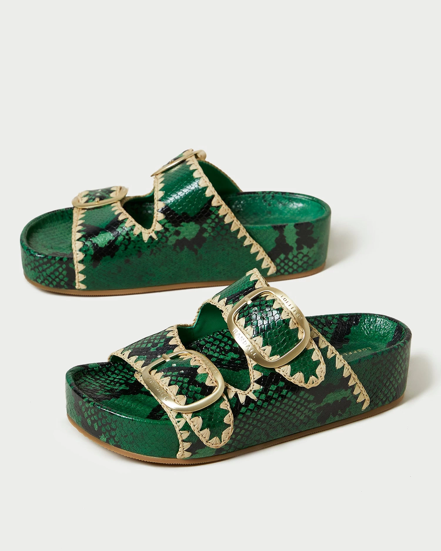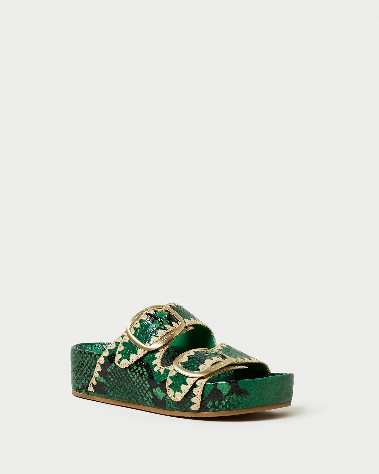Two-band platform footbed sandal in green snake-embossed leather with natural raffia embroidered detailing. Features a padded leather footbed, an open toe, and a slip-on design. 1.5-inch platform.