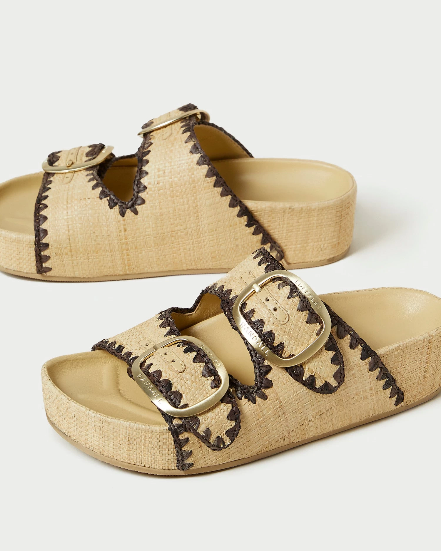 Two-band platform footbed sandal in natural raffia with brown raffia embroidered detailing. Features a padded leather footbed, an open toe, and a slip-on design. 1.5-inch platform.