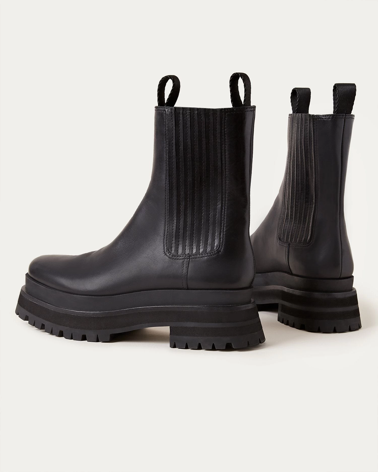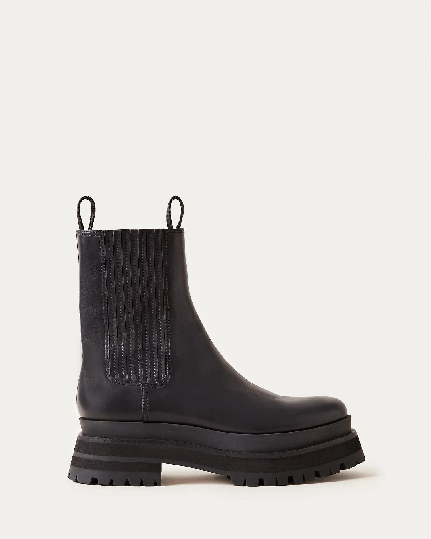 Lug sole platform boot in black soft calf leather. Pulls on with tabs and elastic panels at ankle. Rubber sole.