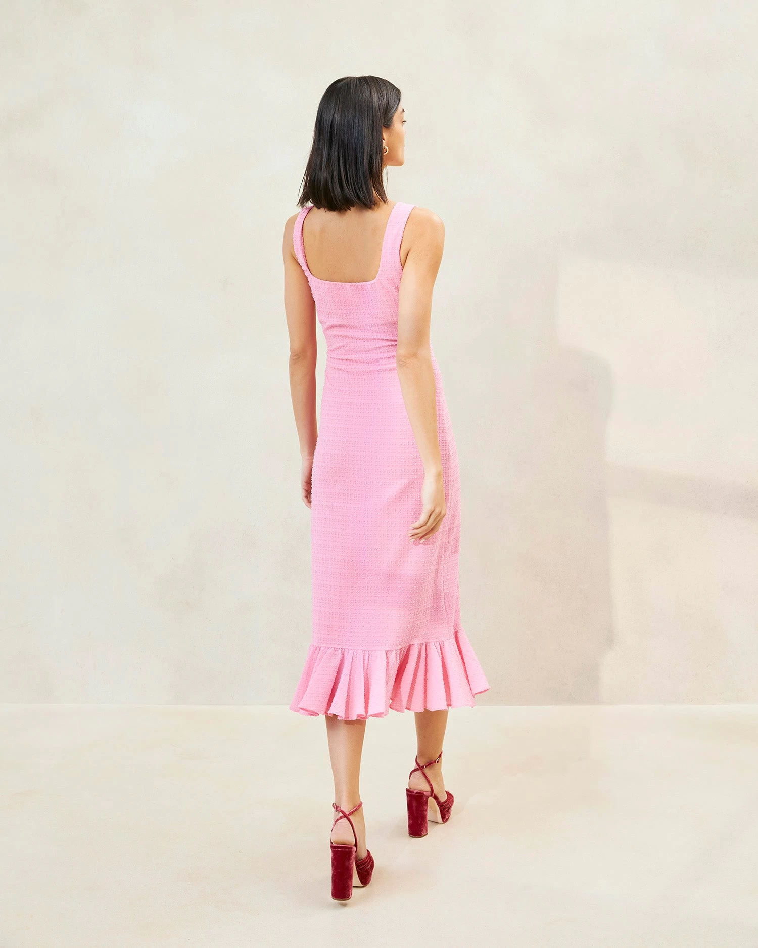 Sleeveless mid-length dress in pink French seersucker. Features a square neckline and a ruffled hem. Yessica’s stretchy fabric imparts a fitted yet comfortable shape. Unlined.