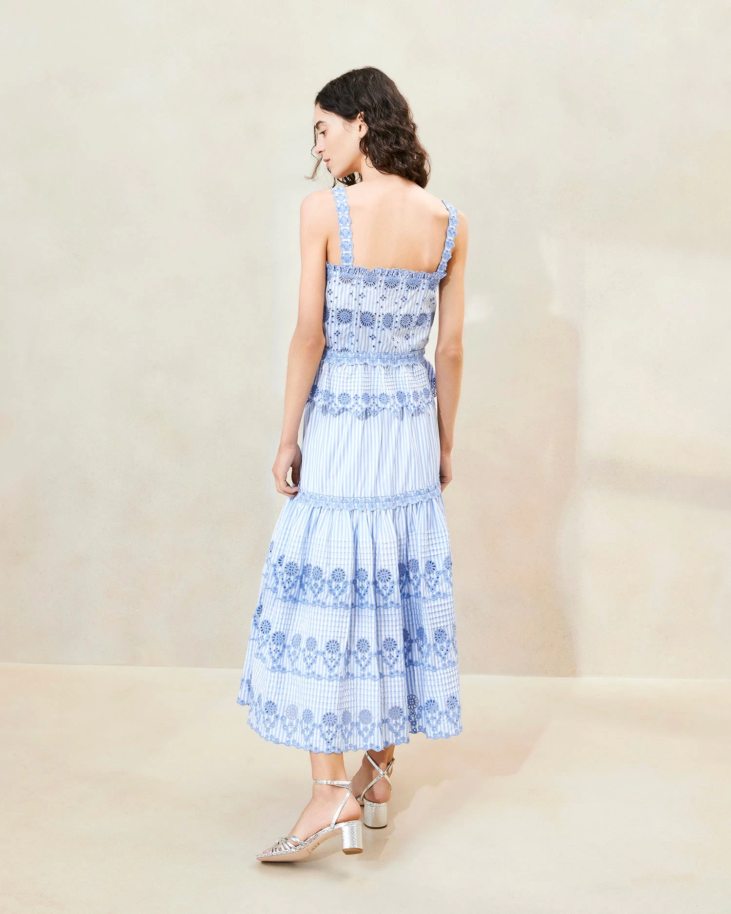 Broderie camisole in blue and cream striped cotton. Unlined and features an adjustable tied waist. Zelda pairs perfectly with our Shireen skirt.